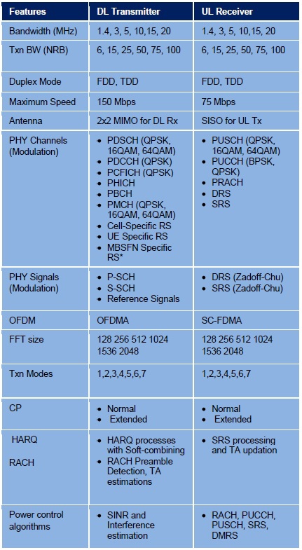 This 3GPP LTE IP (compliant to release 9) eNodeB PHY Baseband and MAC-PHY API. The PHY baseband covers all Downlink Transmitter and Uplink Receiver Physical Channels, Libraries, Algorithms integrated with cross-functional logic as a single PHY solution and interfaced with MAC-PHY API for a seamless integration with 3rd party eNodeB Protocol Stack. The algorithms are optimized and tested with standard 3rd party tier-1 IQ test vectors, test scenarios and interoperated in real-time with UE through RF interface. The DL algorithms have been tested with 3GPP LTE Channel and propagation models for uplink receiver algorithms as per EPA, EVA and ETU for Doppler frequency 5-300Hz as defined by TS36.101 Annexure-B.